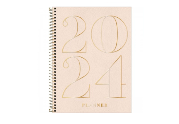 O Planner Executivo Espiral 20 x 27,5 cm Vanilla 2024 pode ser usado para organizar os compromissos do dia a dia, em casa e no trabalho. O produto possui capa em material especial, hot stamping, acabamento espiral, miolo com 80 folhas, com visões anual, mensal e semanal, e bolsa plástica.