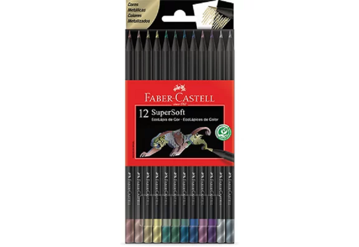 Com o EcoLápis SuperSoft Faber-Castell você terá a melhor qualidade e um lindo resultado em seus trabalhos! São 12 EcoLápis de Cor com exclusivas Cores Metálicas, para um incrível efeito brilhante em suas criações. Eles possuem cores mais vivas e com ótima cobertura, sobre papéis claros e escuros. Mina supermacia exclusiva, garantindo o máximo de conforto ao pintar. Número da Cor no EcoLápis. Produzido com madeira 100% reflorestada e certificada pelo FSC: respeito ao meio ambiente.
